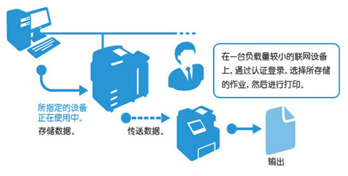 如果你的首选设备正在使用中,则可以使用“无服务器按需打印注1 ”解决方案从另外一台设备输出文件。最多可连接5台设备。当办公室内同时使用A4和A3多功能设备时,A3打印作业将自动缩减为A4。